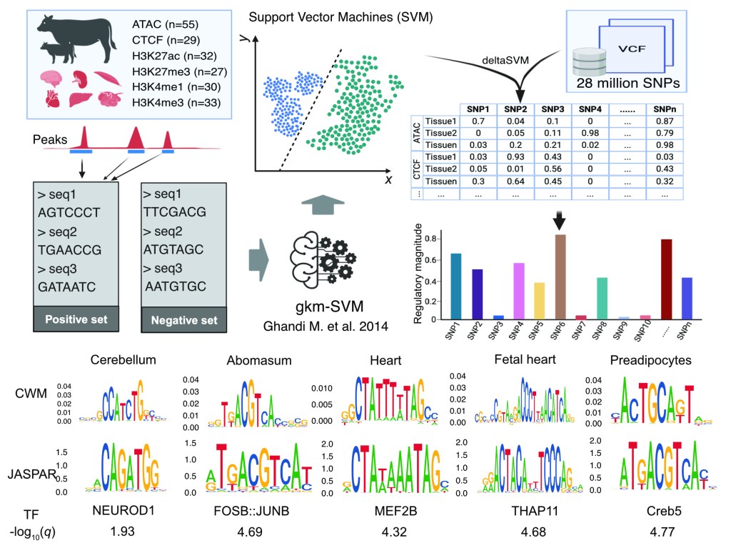 Sequence-to-function modeling uses computational and statistical frameworks to predict how DNA sequence variation influences molecular and organismal phenotypes. In our research, we develop and apply deep-learning and integrative genomics approaches—building on large datasets from ChickenGTEx, FAANG, ENCODE and other resources—to infer regulatory effects directly from primary DNA sequence. These models enable “zero-shot” prediction of gene regulation and variant effects across previously uncharacterized populations and species, bridging the gap between sequence variation, regulatory mechanisms, and complex traits. By doing so, we create powerful tools for uncovering causal variants, prioritizing functional regions, and guiding precision breeding strategies.