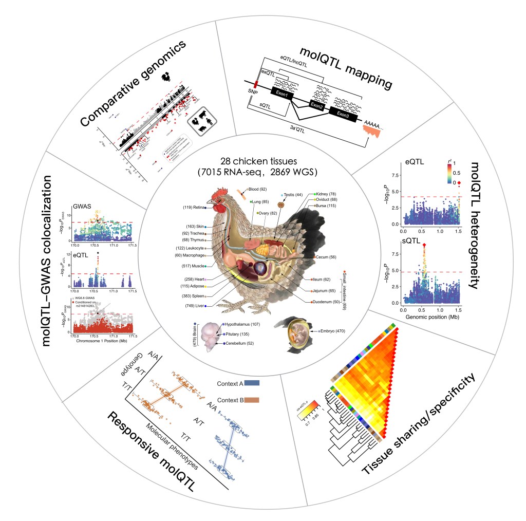 Complex trait genetics explores how numerous genetic variants, often of small individual effect, interact with each other and with the environment to influence multifaceted phenotypes such as growth, reproduction, and disease resistance. In our work, we apply quantitative genetic appraoches (such as genome-wide association study [GWAS], molecular QTL mapping), and integrative multi-omics to dissect the genetic architecture of complex traits and diseases. By linking variation in DNA sequence to changes in molecualr phenotypes, regulatory networks, and phenotypic outcomes, we aim to identify causal loci, reveal underlying biological mechanisms, and provide a predictive framework for breeding and biomedicine.